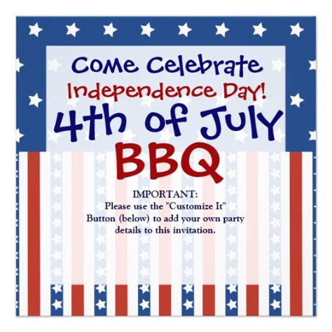 Find customizable July 4 invitations & announcements of all sizes. Pick your favorite invitation design from our amazing selection. ... Add photos and text with our easily customizable templates. ... Red White & Blue Fireworks and Stars 4th of July Invitation. $2.51. 15% Off with code ZAZFAVORITEZ ...